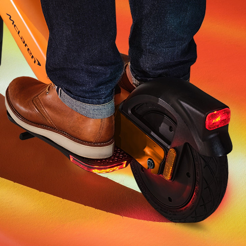 The racing spirit of McLaren, now on two wheels. Our most compact design is built for easy storage and transport, fitting comfortably in a car boot, public transport racks or a small space at home. The ultimate riding position enables the rider to take a natural stance, delivering a more stable, controlled and safer ride. Combined with a long, one-charge range of 25mi (40km) and our most powerful 924W maximum power motor that can handle the toughest of hills up to 19% gradient. Finished in McLaren’s historic papaya. Precision + performance, beyond the racetrack.